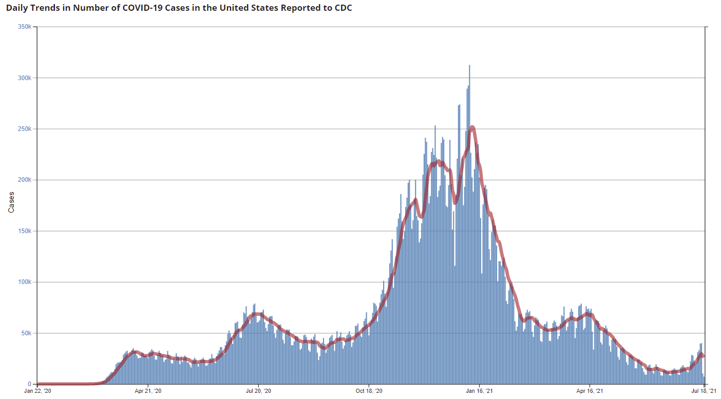 KUDOS to the residents of the 20 states and D.C. that have already achieved the 70% goal (percent over 18 with at least one dose): Vermont, Hawaii, Massachusetts and Connecticut are at 80%+, and Maine, New Mexico, New Jersey, Rhode Island, Pennsylvania, California, Maryland, Washington, New Hampshire, New York, Illinois, Virginia, Delaware, Minnesota, Oregon, Colorado and D.C. are all over 70%.