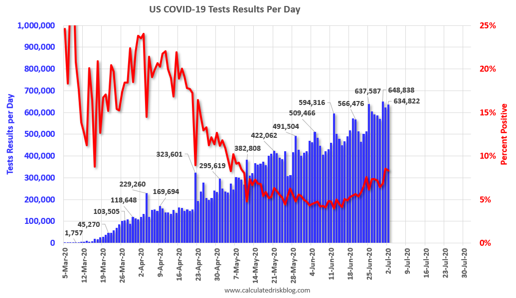 The US is now conducting over 600,000 tests per day, and that might be enough to allow test-and-trace in some areas. Based on the experience of other countries, the percent positive needs to be well under 5% to really push down new infections, so the US still needs to increase the number of tests per day significantly.