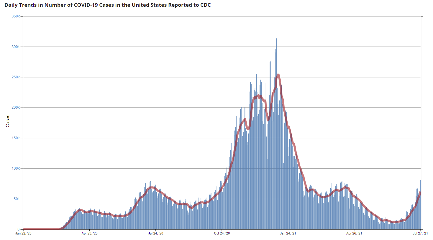KUDOS to the residents of the 20 states and D.C. that have achieved the 70% goal (percent over 18 with at least one dose): Vermont, Hawaii, Massachusetts and Connecticut are at 80%+, and Maine, New Mexico, New Jersey, Rhode Island, Pennsylvania, California, Maryland, Washington, New Hampshire, New York, Illinois, Virginia, Delaware, Minnesota, Oregon, Colorado and D.C. are all over 70%.
