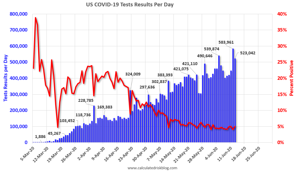 There were 523,042 test results reported over the last 24 hours. This was a new high for the number of test results reported (some states might have had a data dump).