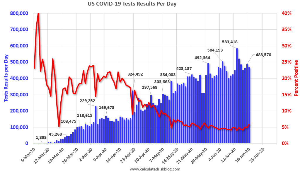 The US is now conducting over 400,000 tests per day, and that might be enough to allow test-and-trace in some areas. Based on the experience of other countries, the percent positive needs to be well under 5% to really push down new infections, so the US still needs to increase the number of tests per day significantly.