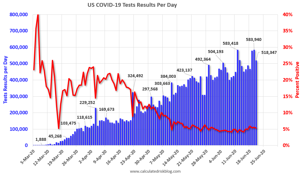 The US is now conducting over 500,000 tests per day, and that might be enough to allow test-and-trace in some areas. Based on the experience of other countries, the percent positive needs to be well under 5% to really push down new infections, so the US still needs to increase the number of tests per day significantly.