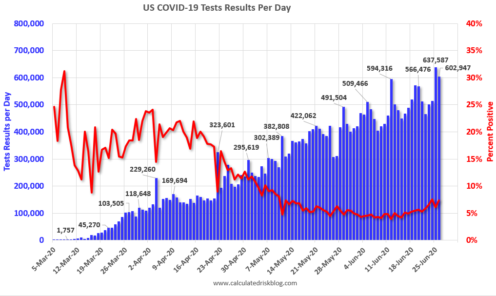 There were 602,947 test results reported over the last 24 hours. This is the most daily results reported (may be a data dump).