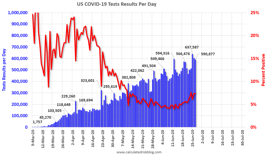 The US is now conducting over 500,000 tests per day, and that might be enough to allow test-and-trace in some areas. Based on the experience of other countries, the percent positive needs to be well under 5% to really push down new infections, so the US still needs to increase the number of tests per day significantly.