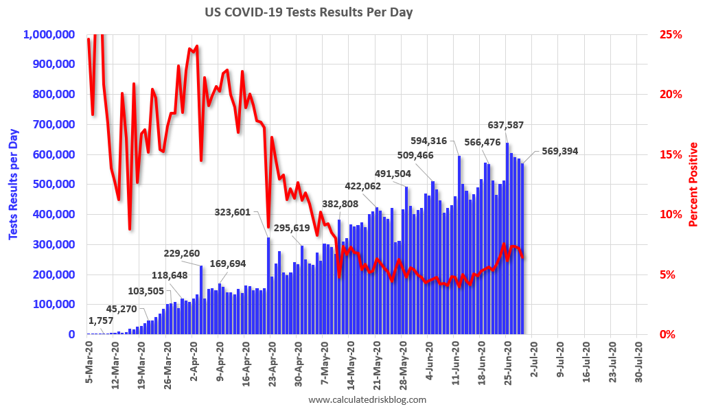 The US is now conducting over 500,000 tests per day, and that might be enough to allow test-and-trace in some areas. Based on the experience of other countries, the percent positive needs to be well under 5% to really push down new infections, so the US still needs to increase the number of tests per day significantly.