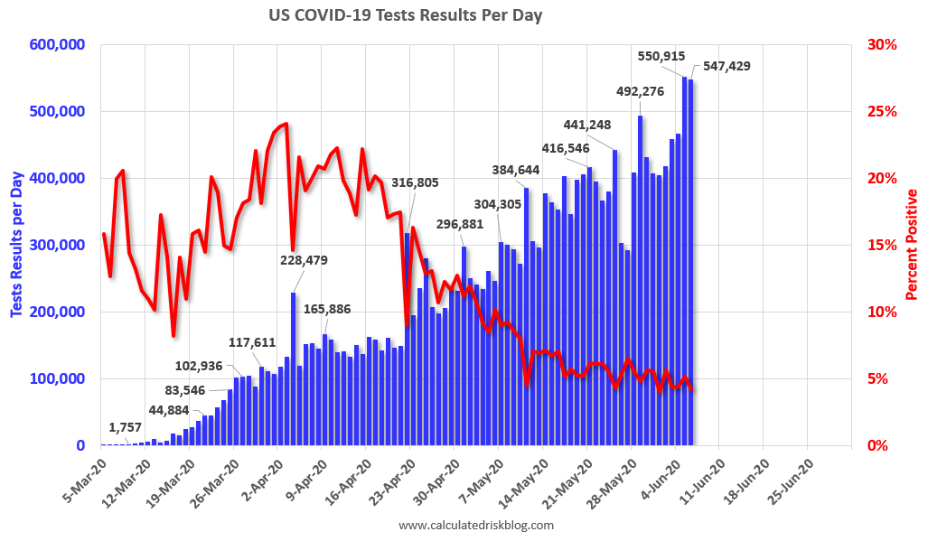 The US is now conducting over 400,000 tests per day, and that might be enough to allow test-and-trace in some areas. Based on the experience of other countries, the percent positive needs to be well under 5% to really push down new infections, so the US still needs to increase the number of tests per day significantly.