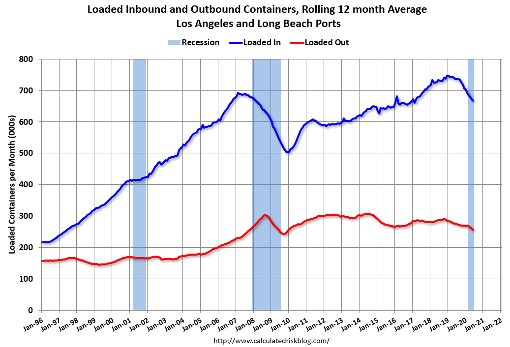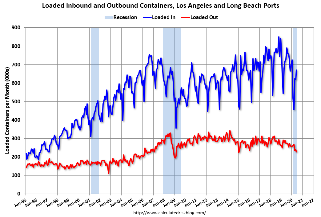 Container traffic gives us an idea about the volume of goods being exported and imported – and usually some hints about the trade report since LA area ports handle about 40% of the nation’s container port traffic.