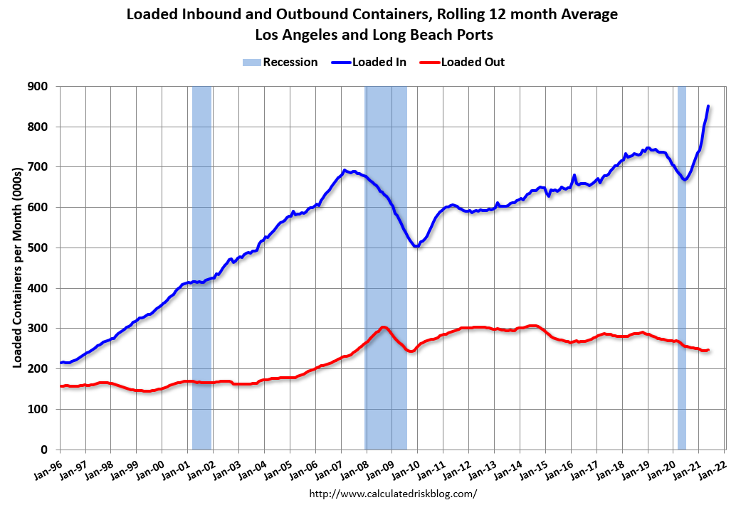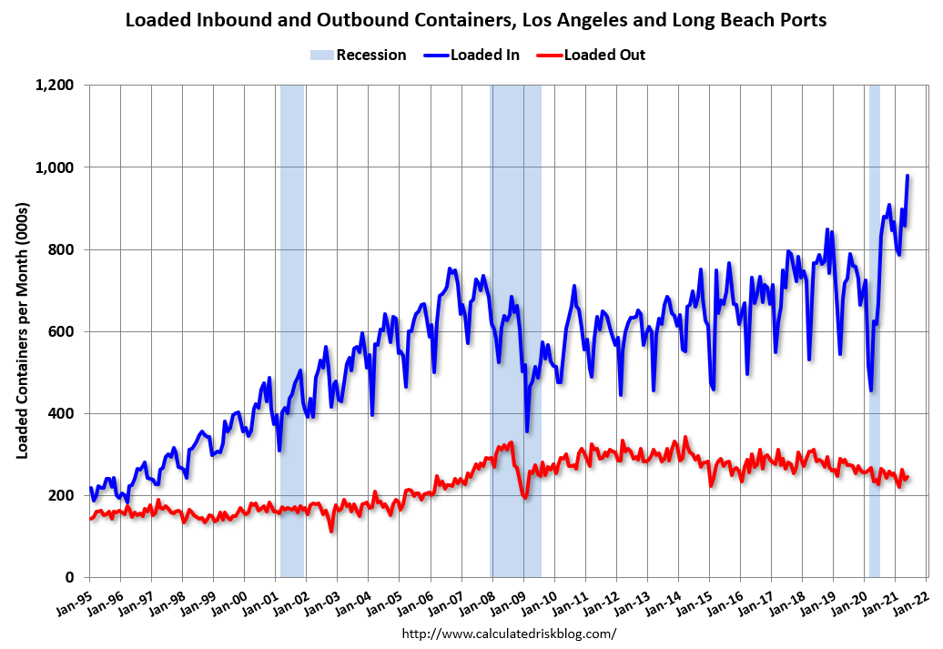 Container traffic gives us an idea about the volume of goods being exported and imported – and usually some hints about the trade report since LA area ports handle about 40% of the nation’s container port traffic.