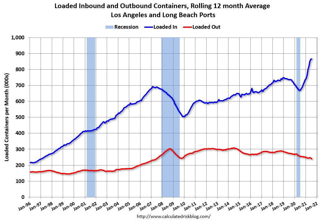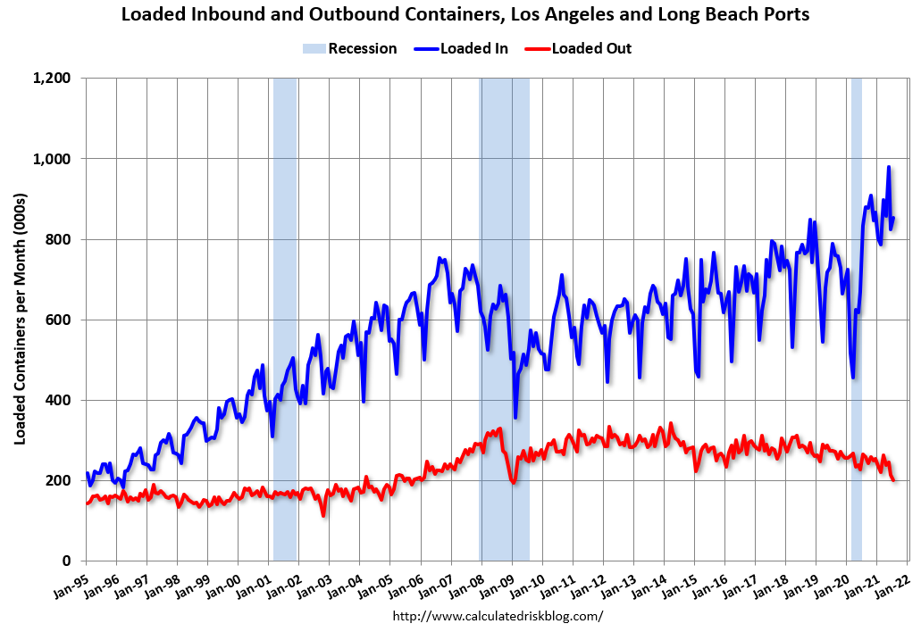 Container traffic gives us an idea about the volume of goods being exported and imported – and usually some hints about the trade report since LA area ports handle about 40% of the nation’s container port traffic.