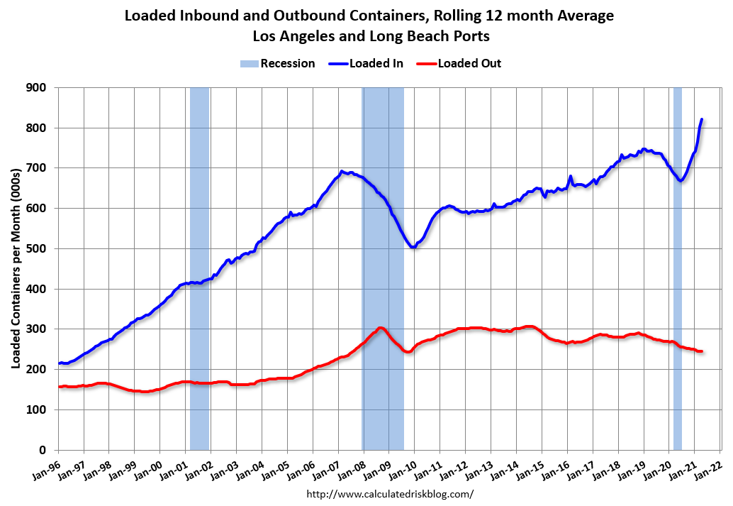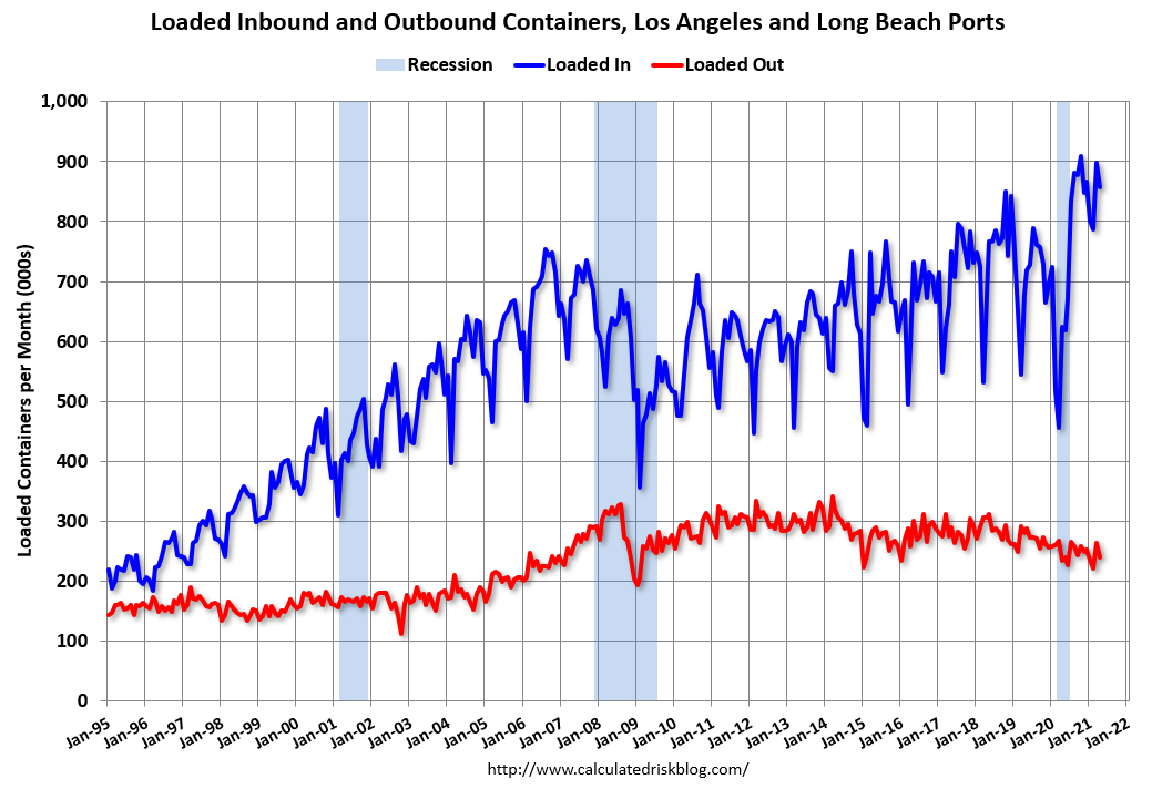 Container traffic gives us an idea about the volume of goods being exported and imported – and usually some hints about the trade report since LA area ports handle about 40% of the nation’s container port traffic.