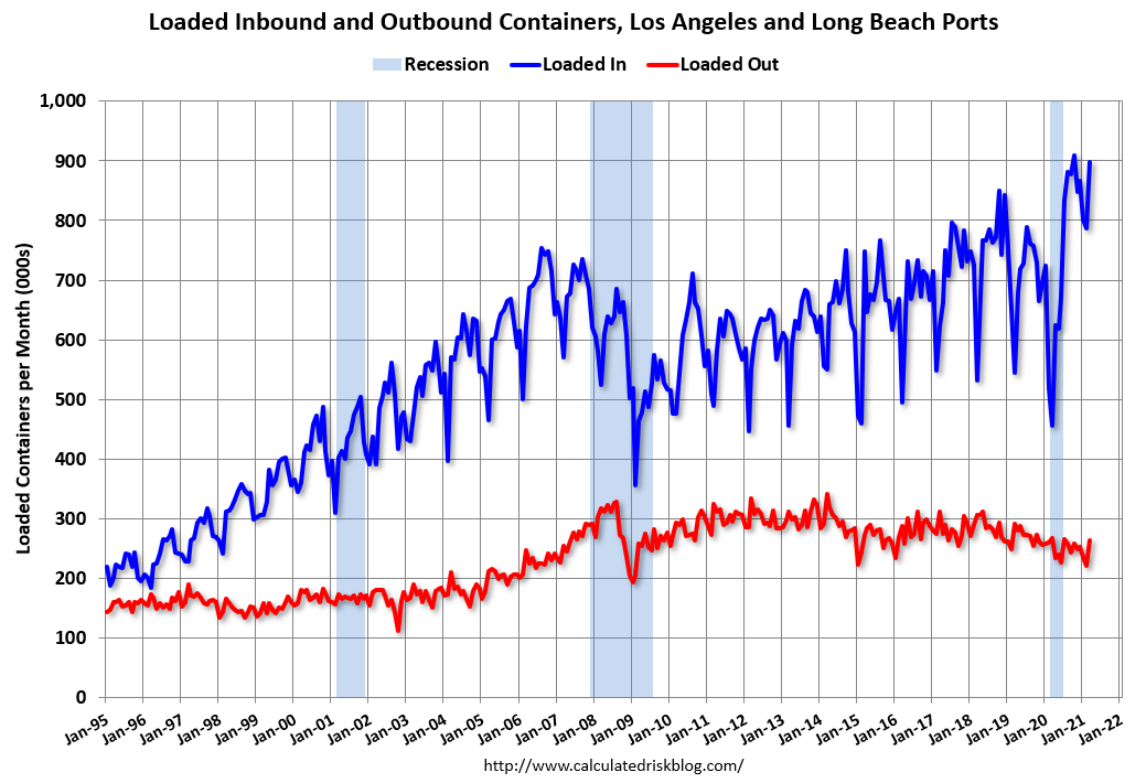 Container traffic gives us an idea about the volume of goods being exported and imported – and usually some hints about the trade report since LA area ports handle about 40% of the nation’s container port traffic.