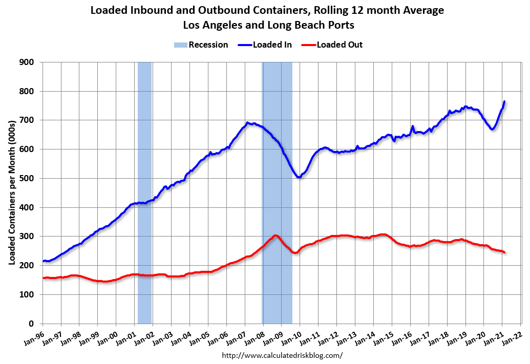 Container traffic gives us an idea about the volume of goods being exported and imported – and usually some hints about the trade report since LA area ports handle about 40% of the nation’s container port traffic.