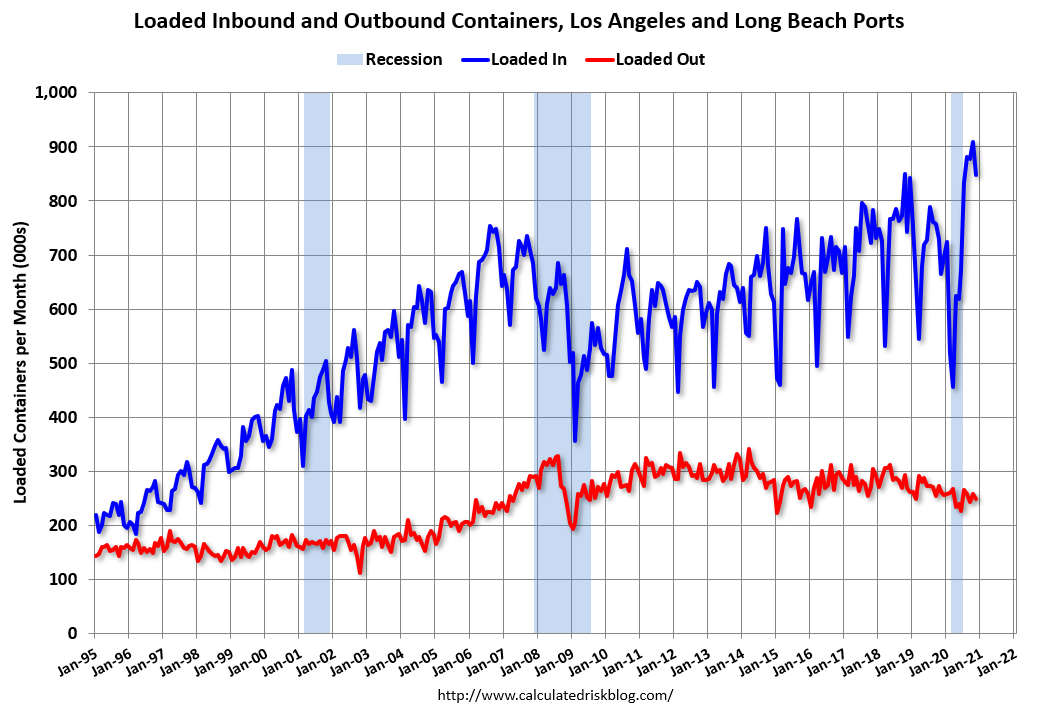 Container traffic gives us an idea about the volume of goods being exported and imported – and usually some hints about the trade report since LA area ports handle about 40% of the nation’s container port traffic.