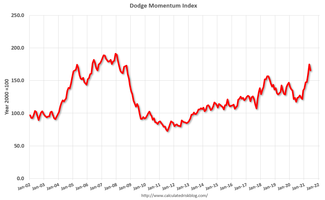 This graph shows the Dodge Momentum Index since 2002. The index was at 165.8 in June, down from 175.1 in May.