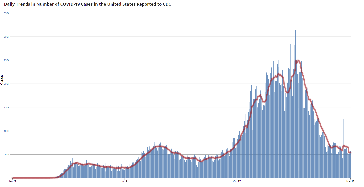 According to the CDC, 115.7 million doses have been administered. 15.9% of the population over 18 is fully vaccinated, and 29.2% of the population over 18 has had at least one dose.