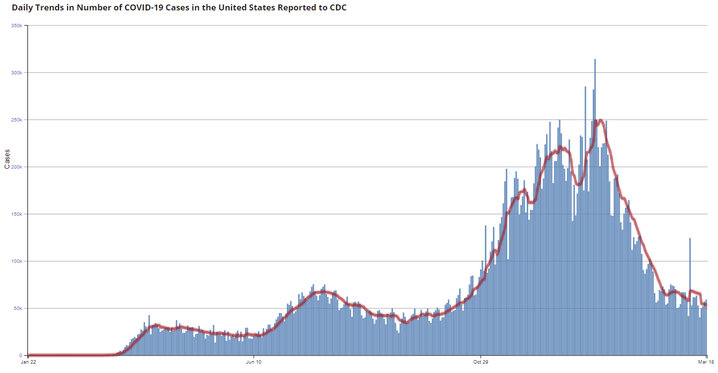 According to the CDC, 118.3 million doses have been administered. 16.2% of the population over 18 is fully vaccinated, and 29.8% of the population over 18 has had at least one dose.