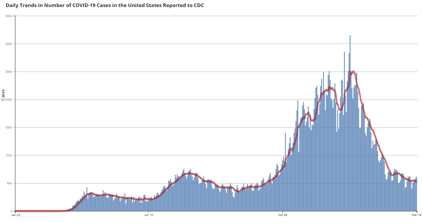According to the CDC, 121.4 million doses have been administered. 16.7% of the population over 18 is fully vaccinated, and 30.7% of the population over 18 has had at least one dose.