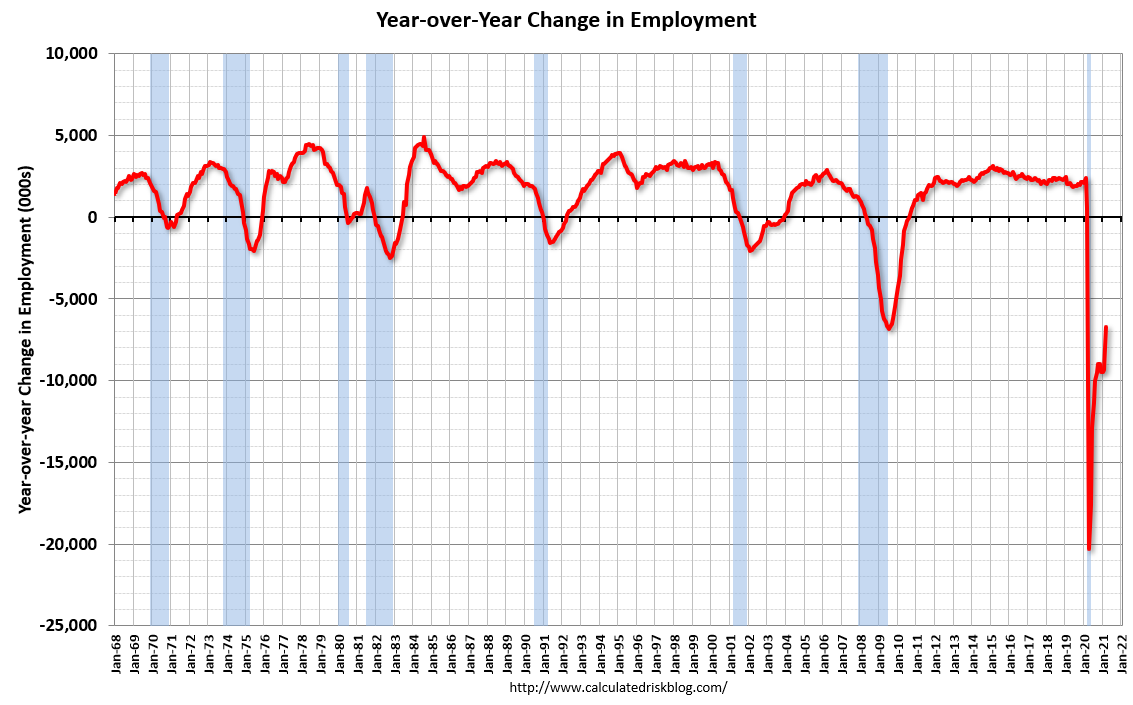 In March, the year-over-year change was negative 6.720 million jobs. Next month, the YoY change will be up significantly – since employment collapsed in April 2020.
