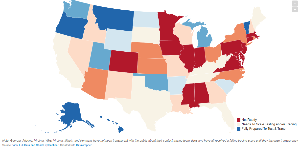 There is a great new website that tracks the progress of each towards test-and-trace. The website also has resources on how to implement test-and-trace. This includes software, training resources, a calculator for how many people to hire and more. Every state should review this site!