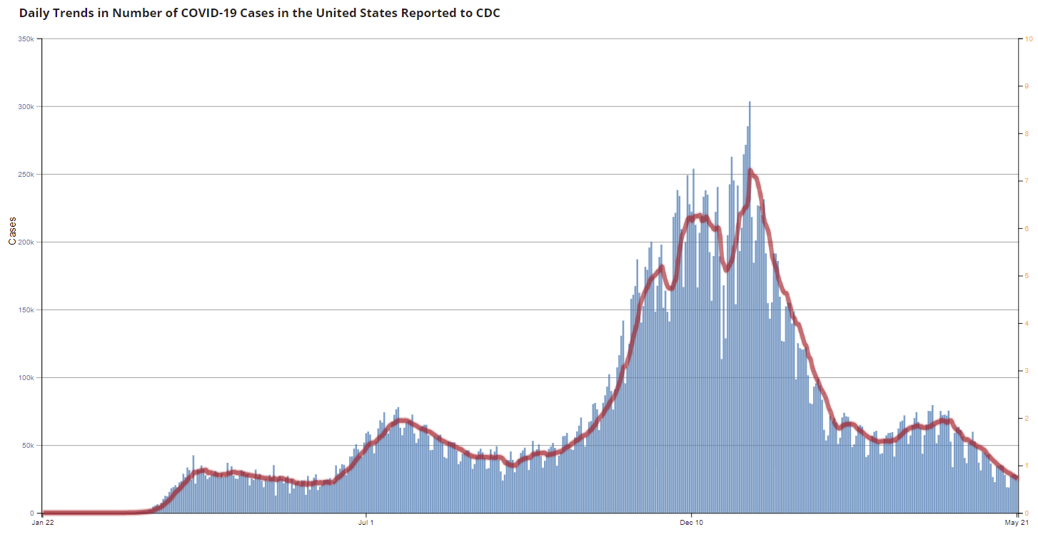 The 7-day average is 25,315, down from 26,362 yesterday, and down sharply from the recent peak of 69,881 on April 13, 2021. This is the lowest since June 15, 2020.