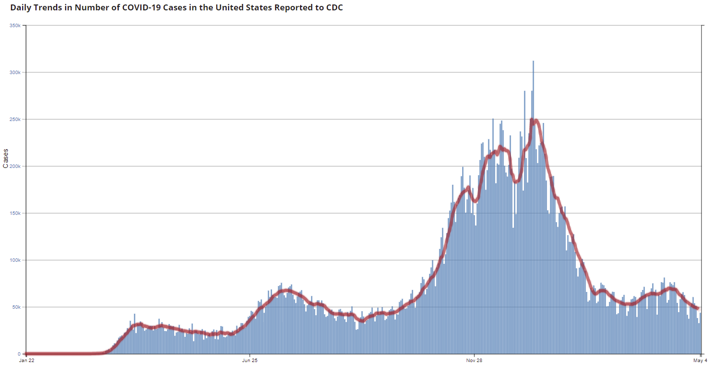 The 7-day average is 47,603, down from 48,585 yesterday, and down from the recent peak of 69,881 on April 13, 2021. This is the lowest since October 8, 2020, but well above the post-summer surge low of 34,668.