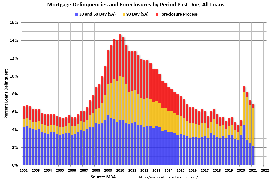 For the purposes of the survey, MBA asks servicers to report loans in forbearance as delinquent if the payment was not made based on the original terms of the mortgage. The delinquency rate was down 35 basis points from the fourth quarter of 2020, and up 202 basis points from one year ago.