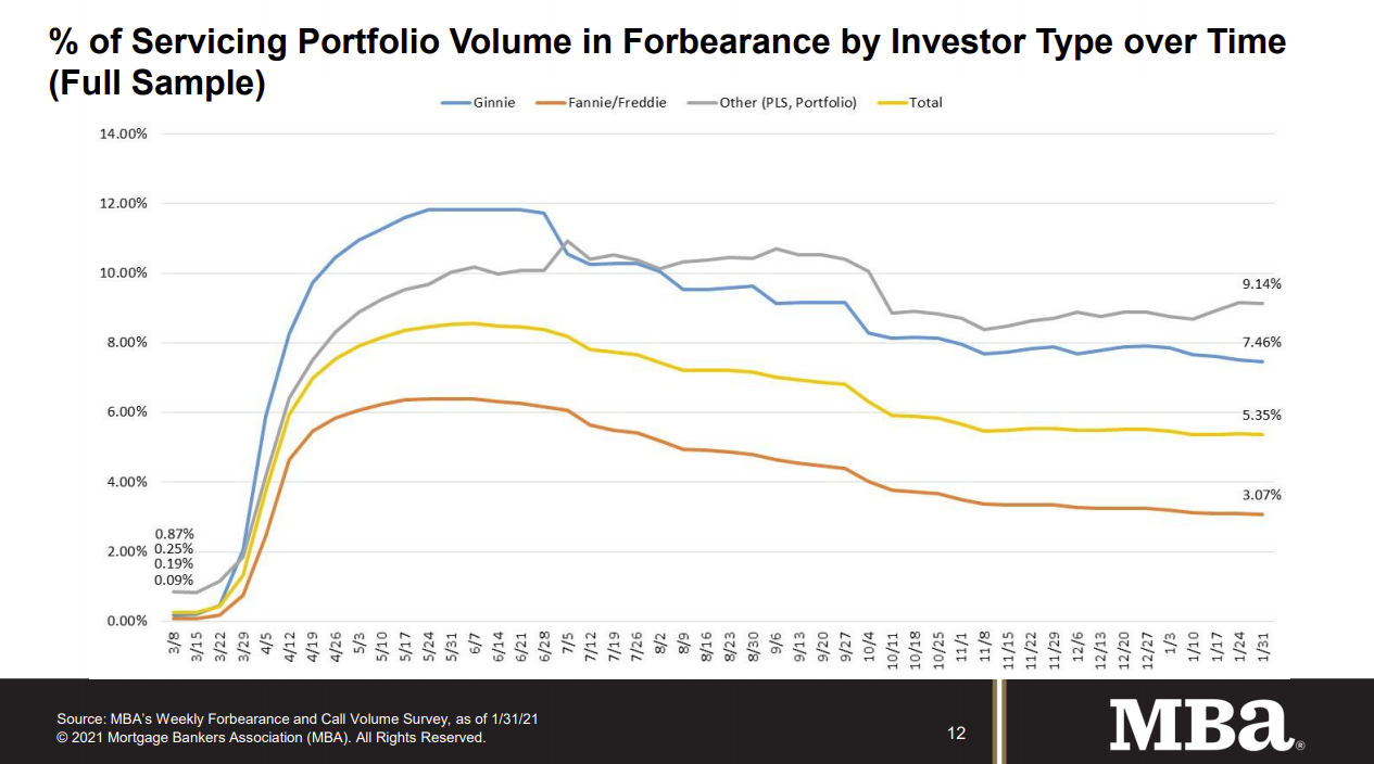 The Mortgage Bankers Association’s (MBA) latest Forbearance and Call Volume Survey revealed that the total number of loans now in forbearance decreased by 3 basis points from 5.38% of servicers’ portfolio volume in the prior week to 5.35% as of January 31, 2021. According to MBA’s estimate, 2.7 million homeowners are in forbearance plans.