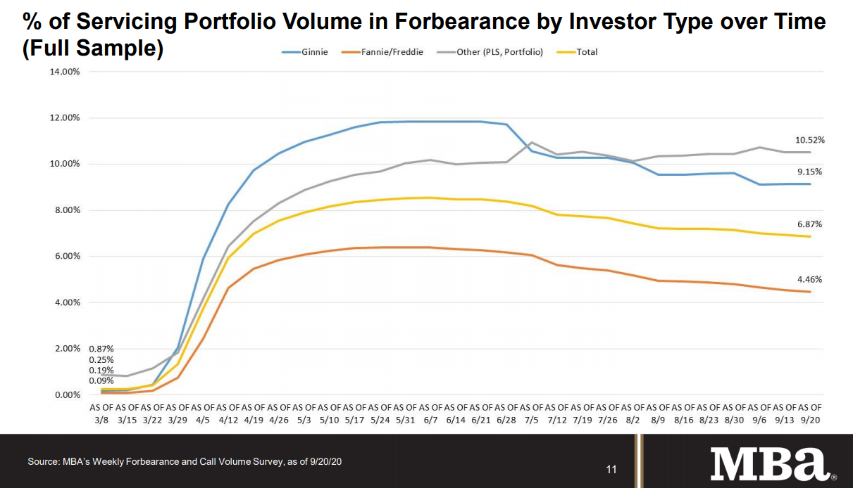 The Mortgage Bankers Association’s (MBA) latest Forbearance and Call Volume Survey revealed that the total number of loans now in forbearance decreased by 6 basis points from 6.93% of servicers’ portfolio volume in the prior week to 6.87% as of September 20, 2020. According to MBA’s estimate, 3.4 million homeowners are in forbearance plans.