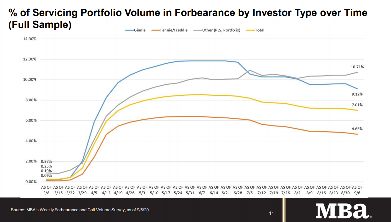 The Mortgage Bankers Association’s (MBA) latest Forbearance and Call Volume Survey revealed that the total number of loans now in forbearance decreased by 15 basis points from 7.16% of servicers’ portfolio volume in the prior week to 7.01% as of September 6, 2020. According to MBA’s estimate, 3.5 million homeowners are in forbearance plans.