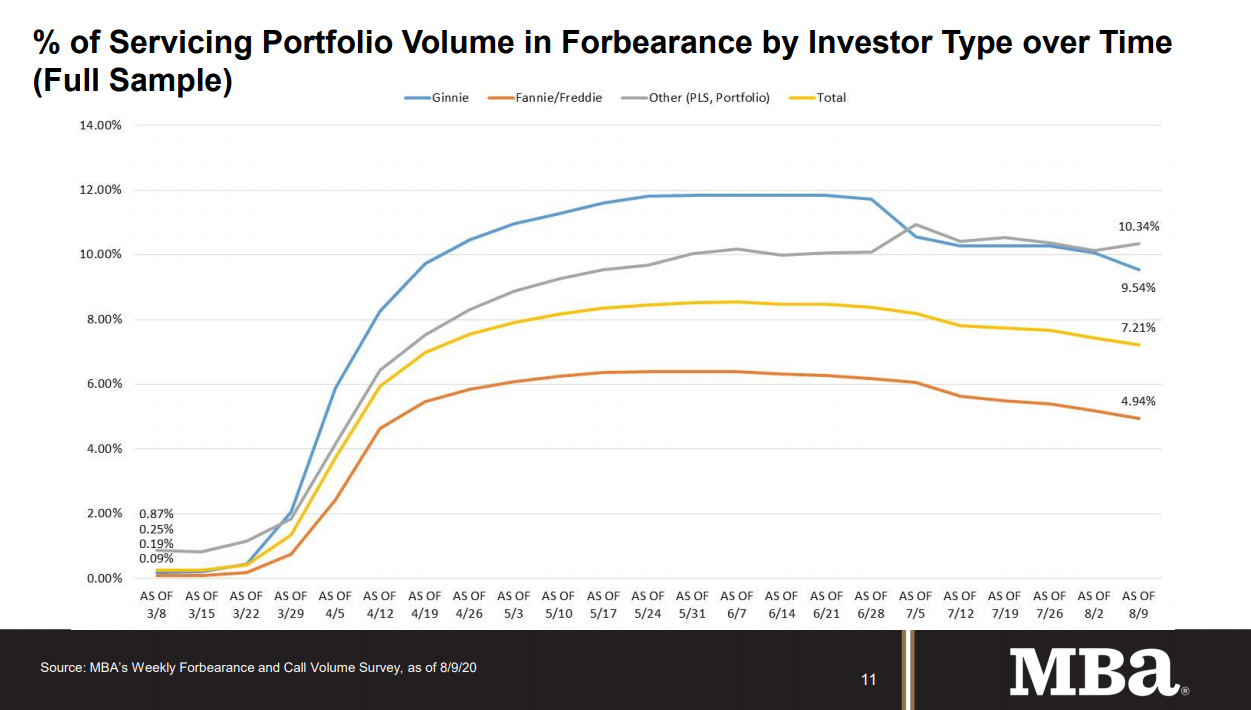 he Mortgage Bankers Association’s (MBA) latest Forbearance and Call Volume Survey revealed that the total number of loans now in forbearance decreased by 23 basis points from 7.44% of servicers’ portfolio volume in the prior week to 7.21% as of August 9, 2020. According to MBA’s estimate, 3.6 million homeowners are in forbearance plans.