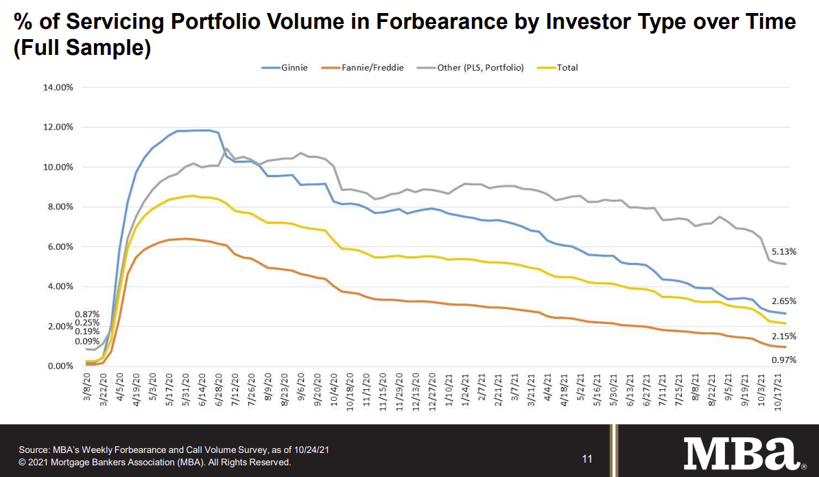 The Mortgage Bankers Association’s (MBA) latest Forbearance and Call Volume Survey revealed that the total number of loans now in forbearance decreased by 6 basis points from 2.21% of servicers’ portfolio volume in the prior week to 2.15% as of October 24, 2021. According to MBA’s estimate, 1.1 million homeowners are in forbearance plans.