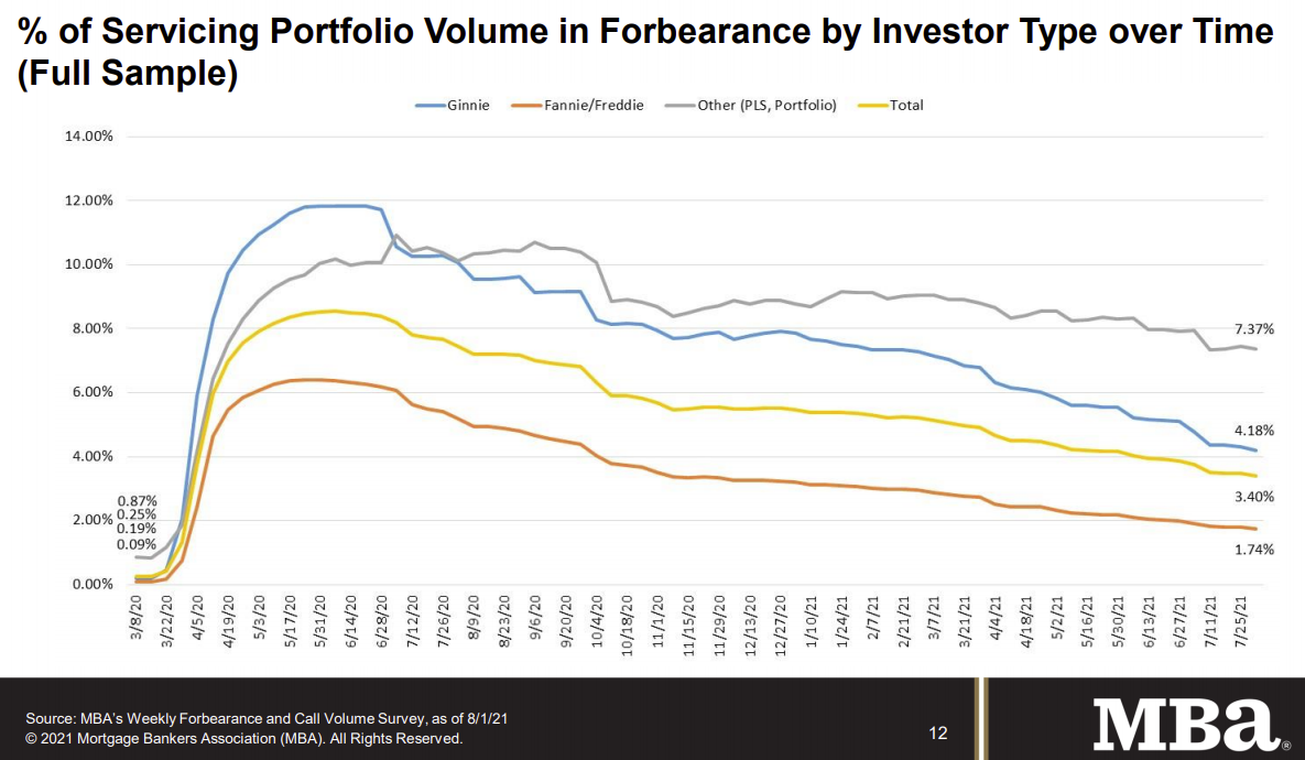 The Mortgage Bankers Association’s (MBA) latest Forbearance and Call Volume Survey revealed that the total number of loans now in forbearance decreased by 7 basis points from 3.47% of servicers’ portfolio volume in the prior week to 3.40% as of August 1, 2021. According to MBA’s estimate, 1.7 million homeowners are in forbearance plans.