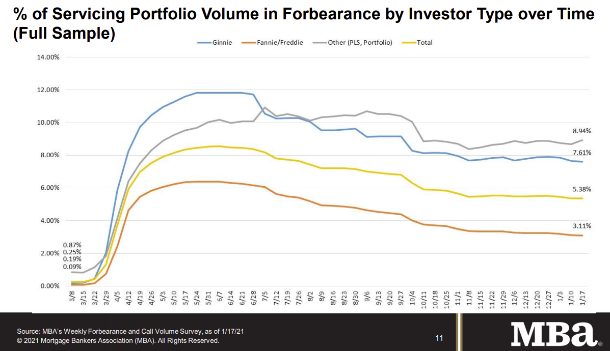 The Mortgage Bankers Association’s (MBA) latest Forbearance and Call Volume Survey revealed that the total number of loans now in forbearance increased slightly from 5.37% of servicers’ portfolio volume in the prior week to 5.38% as of January 17, 2021. According to MBA’s estimate, 2.7 million homeowners are in forbearance plans.