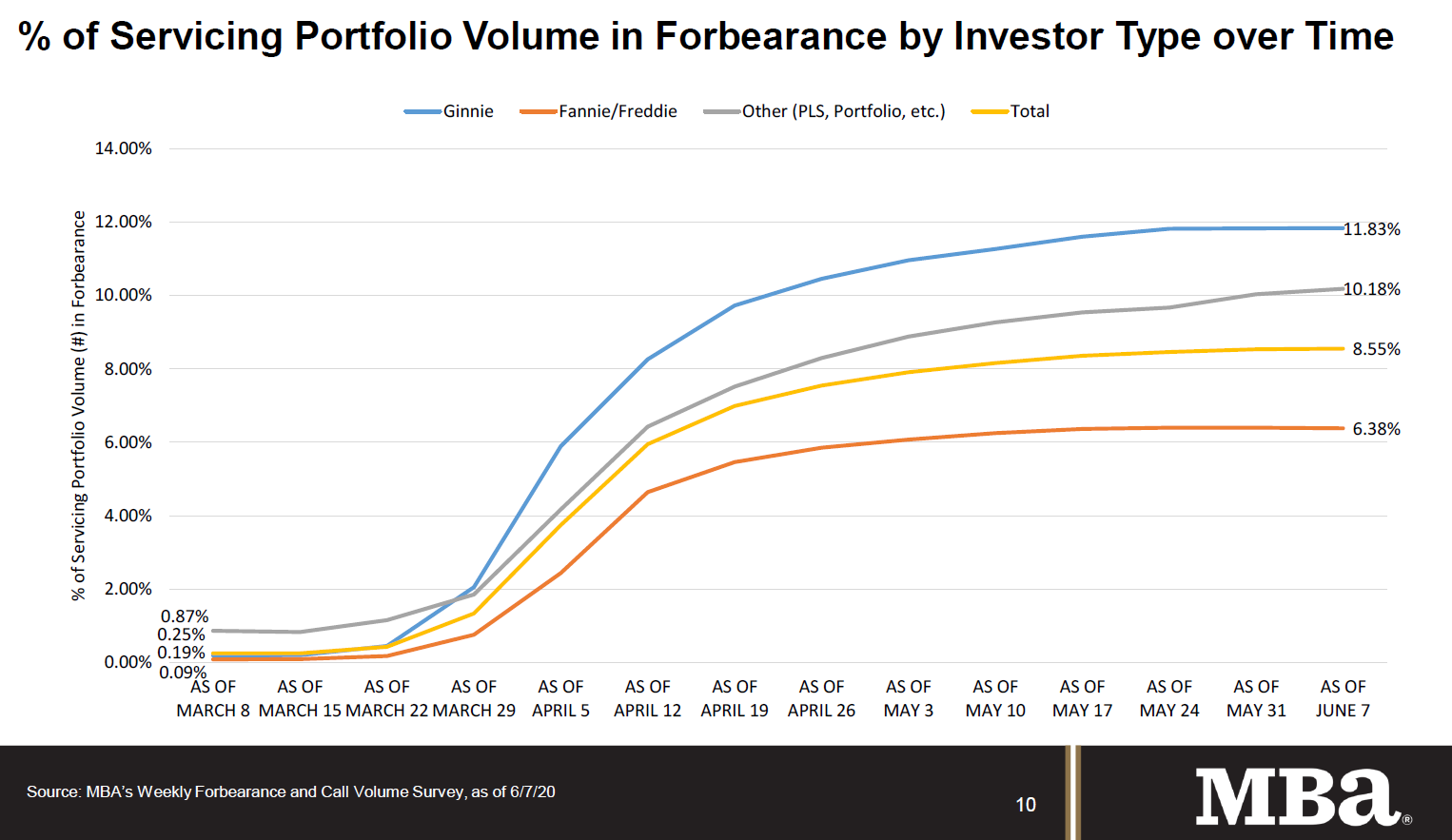 The Mortgage Bankers Association’s (MBA) latest Forbearance and Call Volume Survey revealed that the total number of loans now in forbearance increased from 8.53% of servicers’ portfolio volume in the prior week to 8.55% as of June 7, 2020. According to MBA’s estimate, almost 4.3 million homeowners are now in forbearance plans.