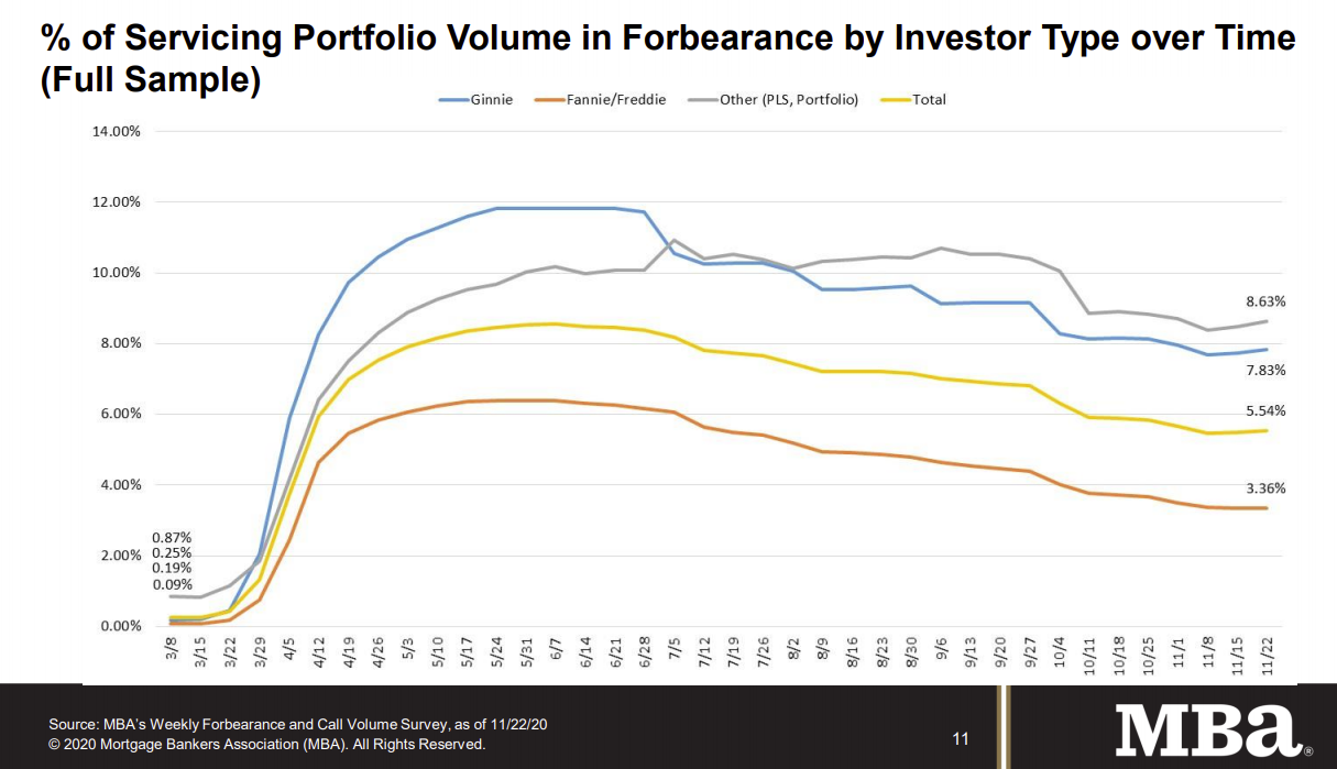 The Mortgage Bankers Association’s (MBA) latest Forbearance and Call Volume Survey revealed that the total number of loans now in forbearance increased from 5.48% of servicers’ portfolio volume in the prior week to 5.54% as of November 22, 2020. According to MBA’s estimate, 2.8 million homeowners are in forbearance plans.