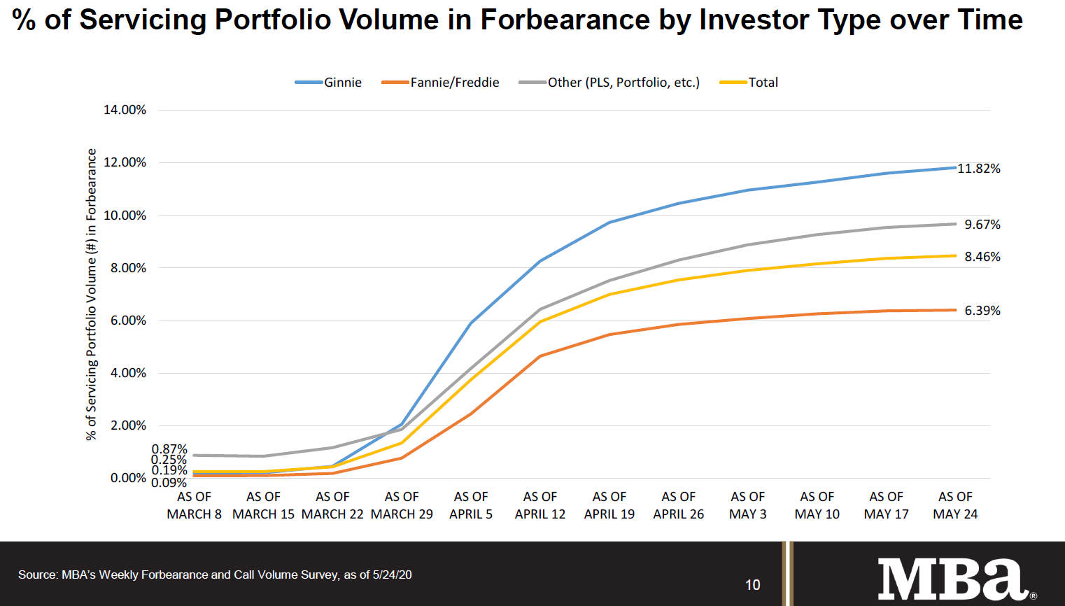 The Mortgage Bankers Association’s (MBA) latest Forbearance and Call Volume Survey revealed that the total number of loans now in forbearance increased from 8.36% of servicers’ portfolio volume in the prior week to 8.46% as of May 24, 2020. According to MBA’s estimate, just over 4.2 million homeowners are now in forbearance plans.