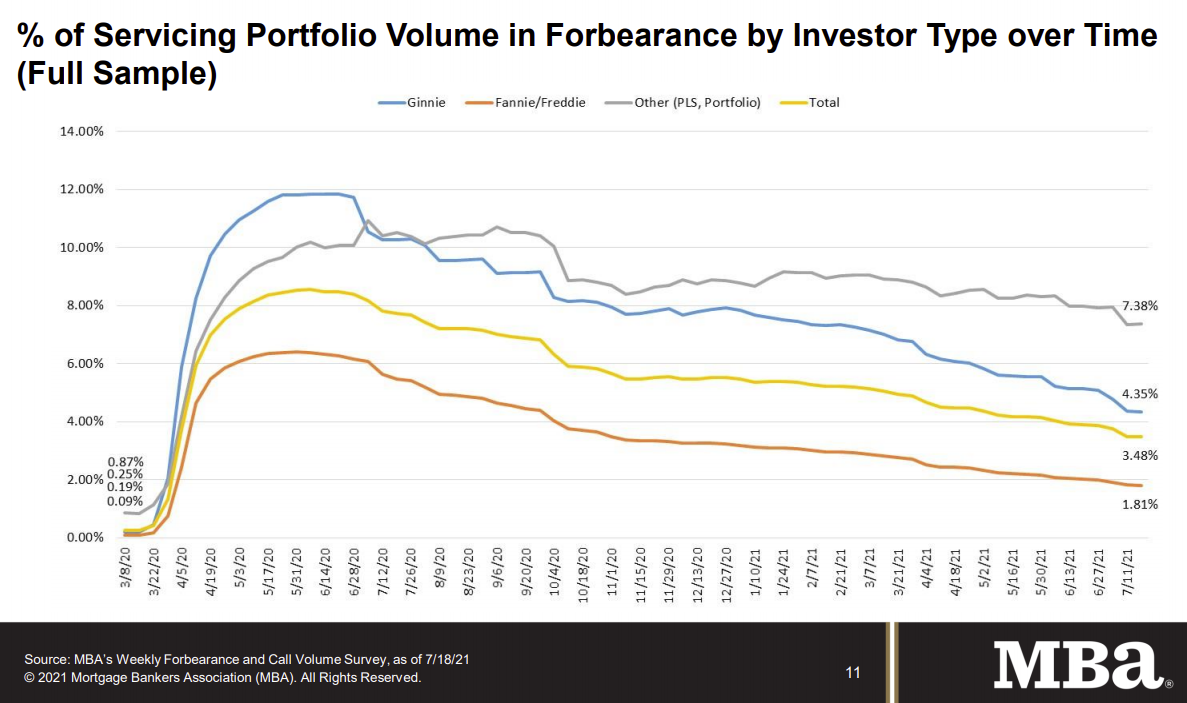 The Mortgage Bankers Association’s (MBA) latest Forbearance and Call Volume Survey revealed that the total number of loans now in forbearance decreased by 2 basis points from 3.50% of servicers’ portfolio volume in the prior week to 3.48% as of July 18, 2021. According to MBA’s estimate, 1.74 million homeowners are in forbearance plans.