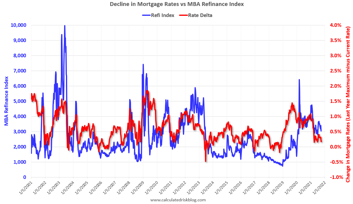 The following graph shows the MBA Refinance Index (Blue) and the change in mortgage rates (Red). The change is calculated as Maximum in Previous Year minus the current rate). When the red line is above 0.5% (more than 50bps decline in mortgage rates), then refinance activity generally picks up.