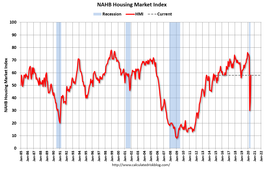 In a sign that housing stands poised to lead a post-pandemic economic recovery, builder confidence in the market for newly-built single-family homes jumped 21 points to 58 in June, according to the latest National Association of Home Builders/Wells Fargo Housing Market Index (HMI). Any reading above 50 indicates a positive market.