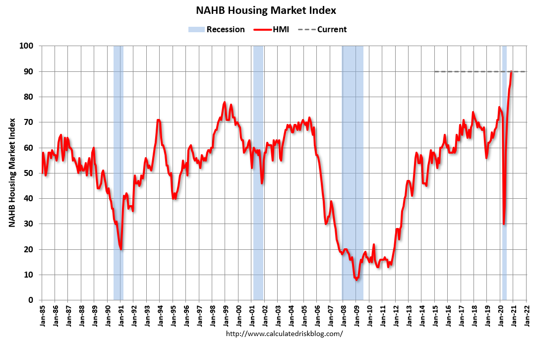 “Another record high for the HMI reflects that housing is a bright spot for the economy,” said NAHB Chief Economist Robert Dietz. “However, affordability remains an ongoing concern, as construction costs continue to rise and interest rates are expected to move higher as more positive news emerges on the coronavirus vaccine front. In the short run, the shift of housing demand to lower density markets such as suburbs and exurbs with ongoing low resale inventory levels is supporting demand for home building.”