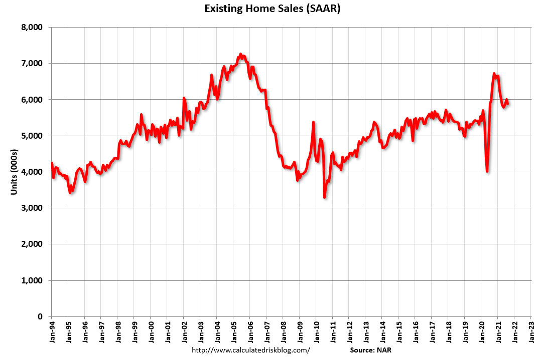 This graph shows existing home sales, on a Seasonally Adjusted Annual Rate (SAAR) basis since 1993.