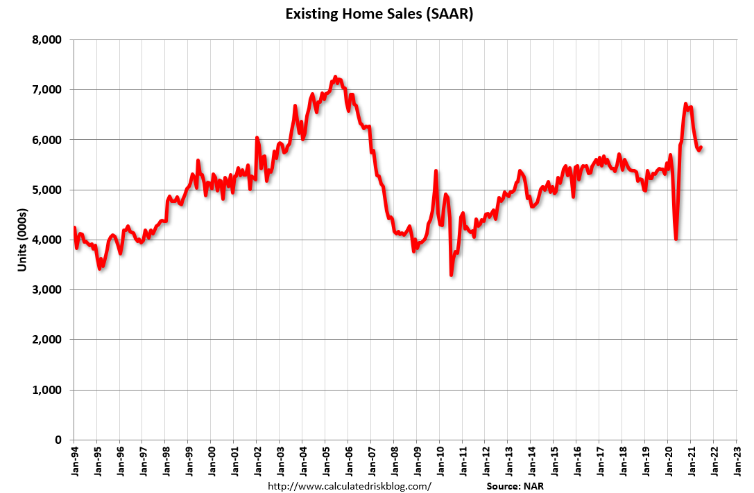 This graph shows existing home sales, on a Seasonally Adjusted Annual Rate (SAAR) basis since 1993.