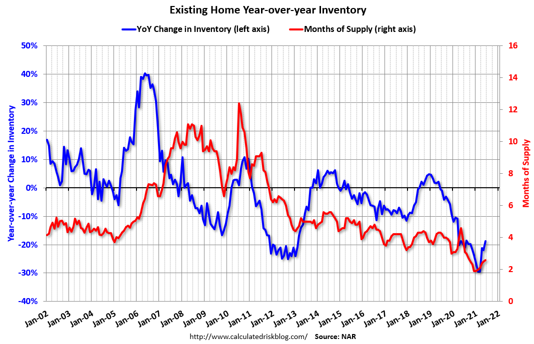 The last graph shows the year-over-year (YoY) change in reported existing home inventory and months-of-supply. Since inventory is not seasonally adjusted, it really helps to look at the YoY change. Note: Months-of-supply is based on the seasonally adjusted sales and not seasonally adjusted inventory.
