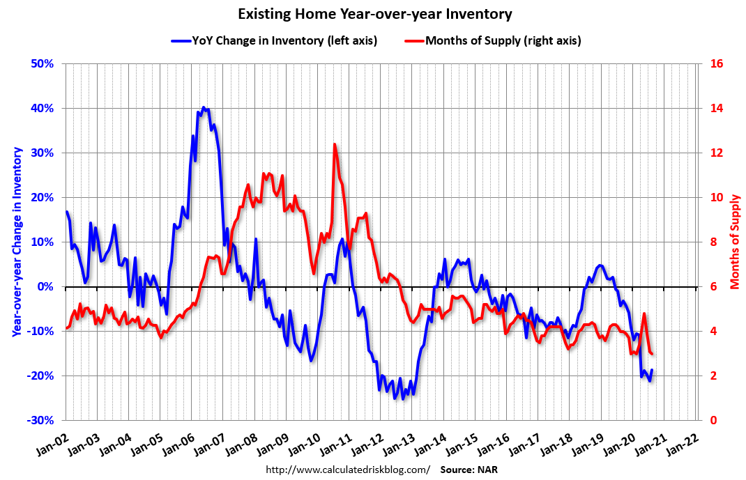 The last graph shows the year-over-year (YoY) change in reported existing home inventory and months-of-supply. Since inventory is not seasonally adjusted, it really helps to look at the YoY change. Note: Months-of-supply is based on the seasonally adjusted sales and not seasonally adjusted inventory.