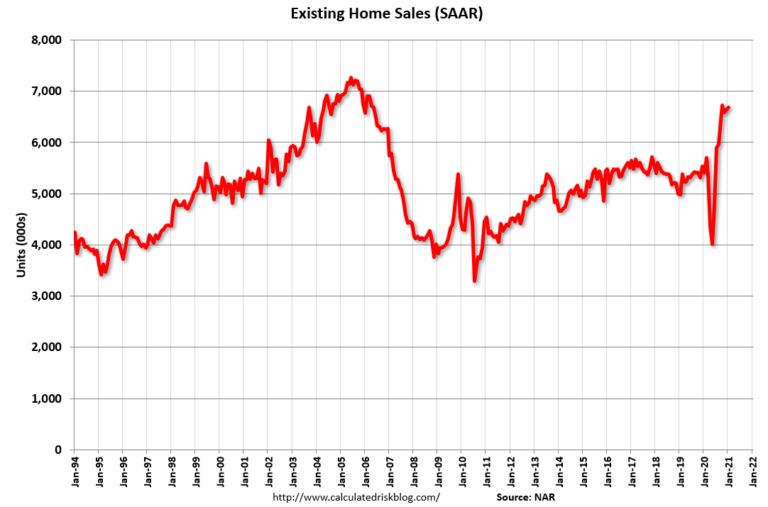 Total existing-home sales, completed transactions that include single-family homes, townhomes, condominiums and co-ops, increased 0.6% from December to a seasonally-adjusted annual rate of 6.69 million in January. Sales in total climbed year-over-year, up 23.7% from a year ago (5.41 million in January 2020).