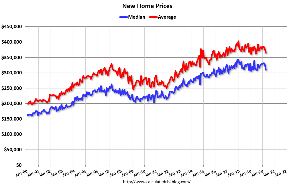 From the Census Bureau: “The median sales price of new houses sold in April 2020 was $309,900. The average sales price was $364,500.”