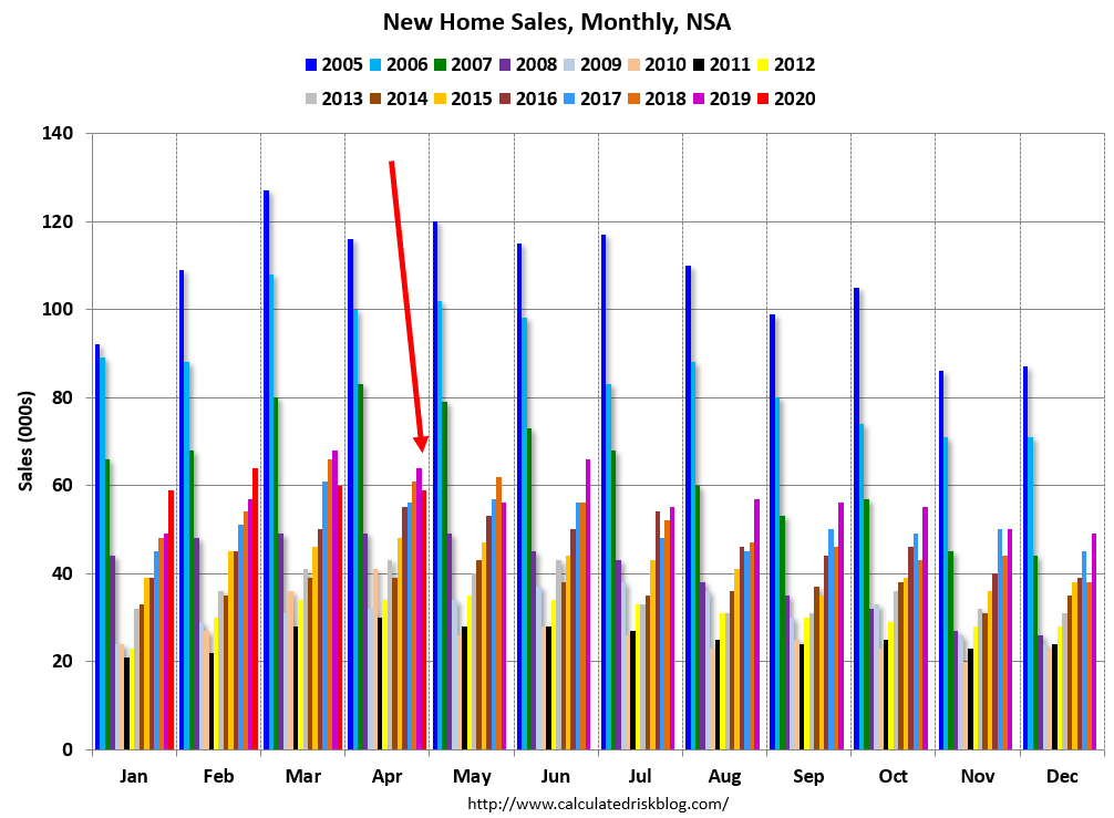 In April 2020 (red column), 59 thousand new homes were sold (NSA). Last year, 64 thousand homes were sold in April.