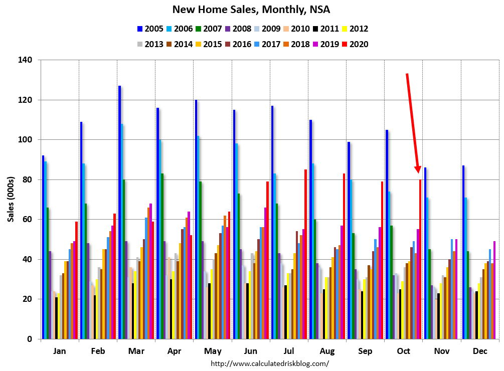 In October 2020 (red column), 80 thousand new homes were sold (NSA). Last year, 55 thousand homes were sold in October.