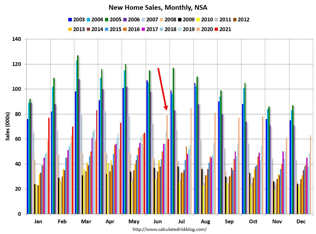In June 2021 (red column), 60 thousand new homes were sold (NSA). Last year, 79 thousand homes were sold in June.