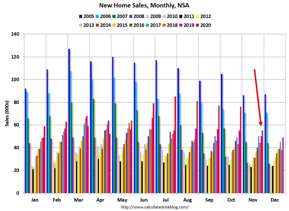 In November 2020 (red column), 55 thousand new homes were sold (NSA). Last year, 50 thousand homes were sold in November.